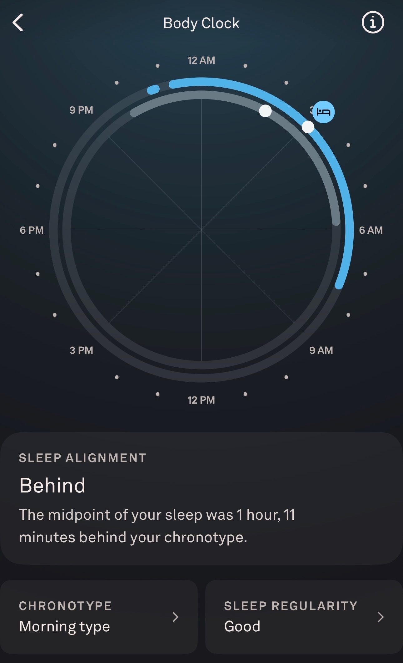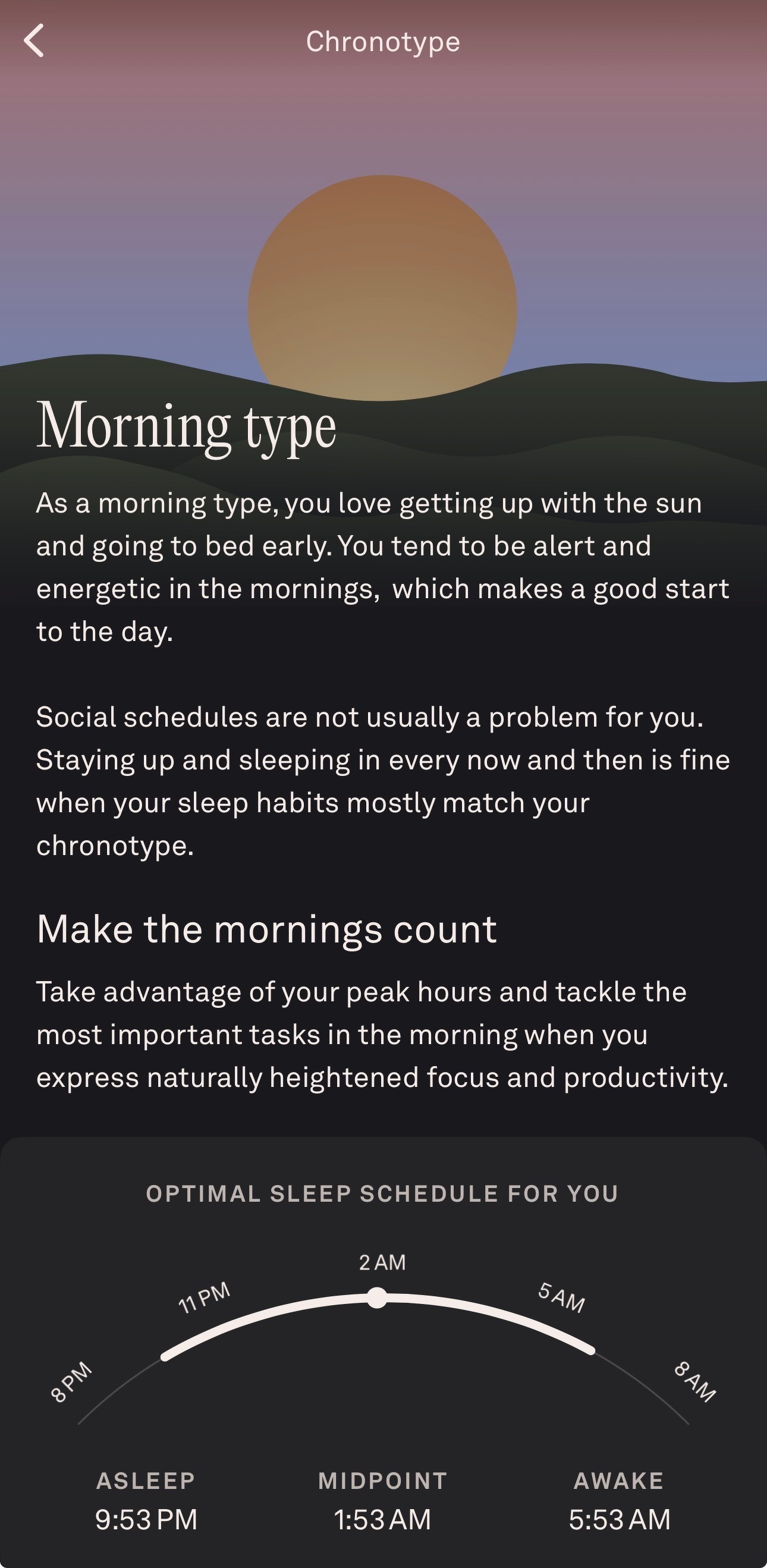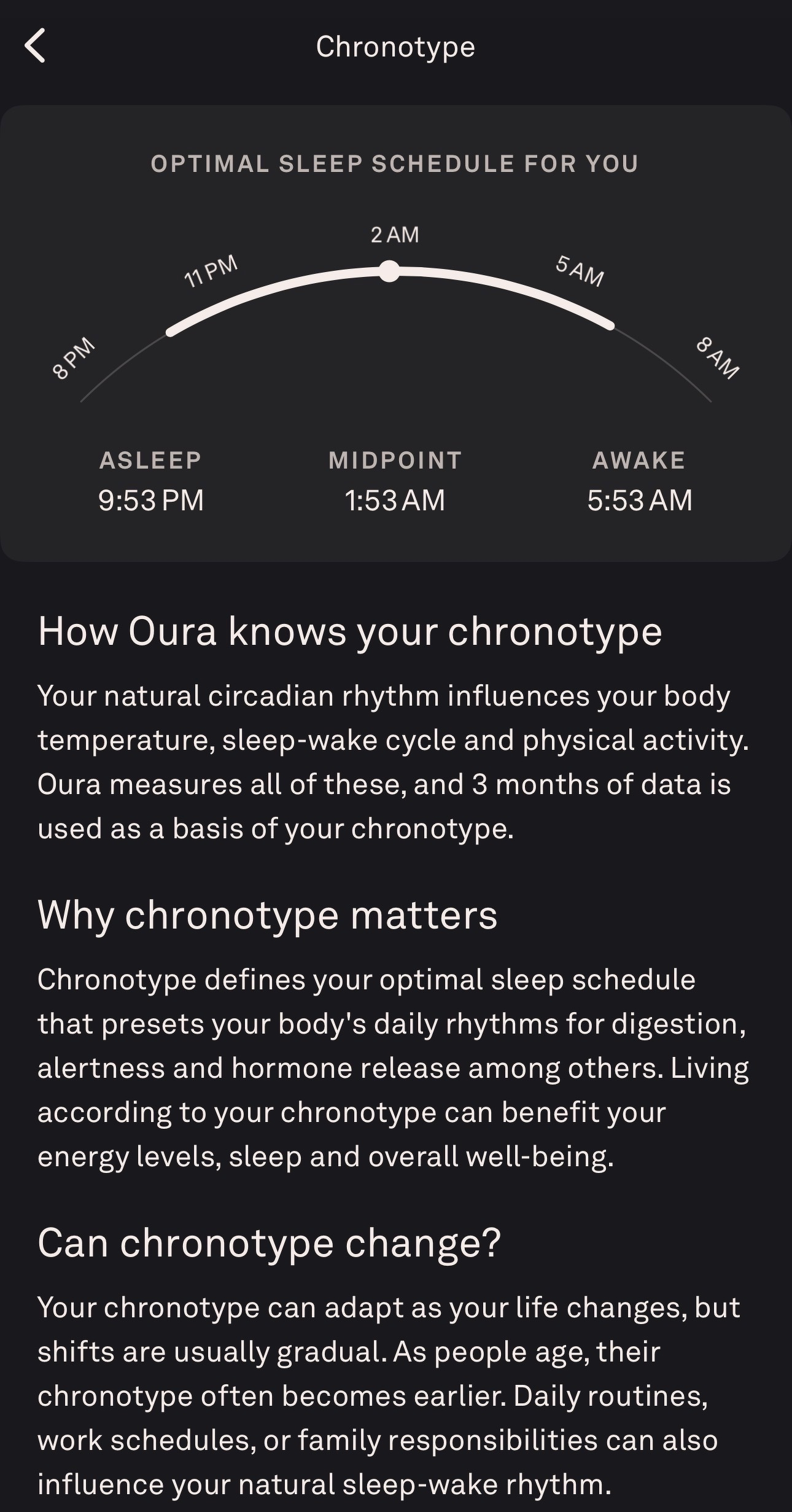 The Oura app finally gave me my chronotype and body clock since my last post. I am officially a “morning type” based on its assessment, and supposedly my ideal sleeping time is 9:53pm, midpoint at 1:53am, and awake at 5:53am. It’s kind of cool to know this. My Oura sleep stats have worsened the last week or two as I think the scores are more calibrated to my baseline rather than the generic person, although I am very fortunate to sleep mostly well most nights. My weekend scores are invariably better with not waking up at 4:45 am. It will be cool to see more as things progress.