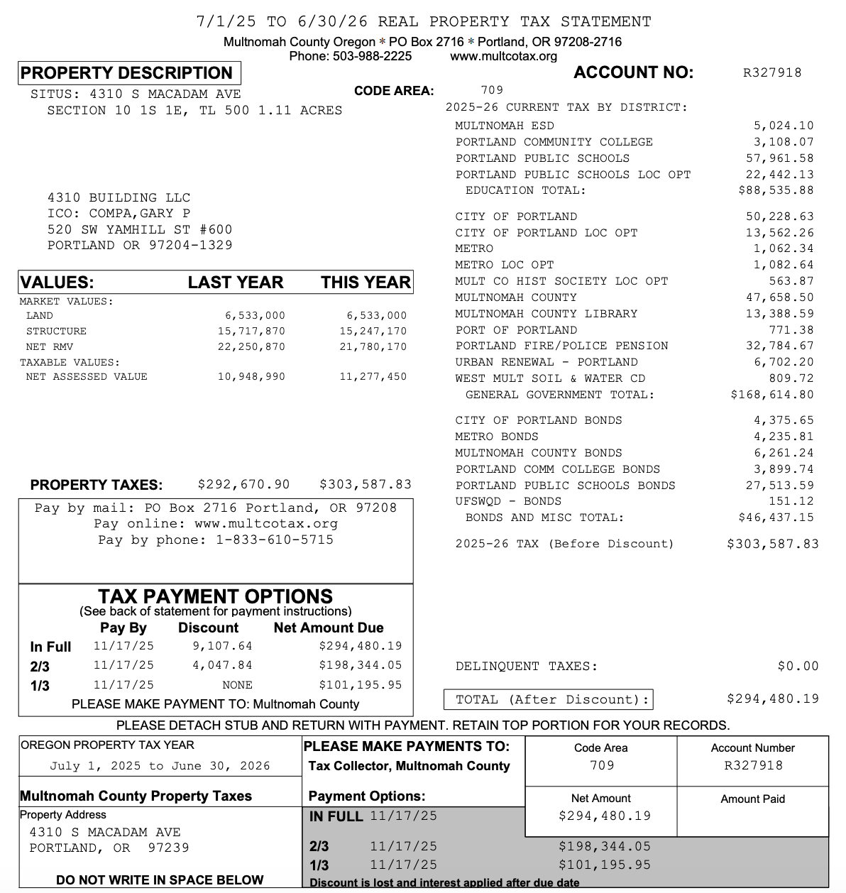 The address is 4310 S Macadam Ave in Portland, Oregon, 97239 (Multnomah County tax account number R327918).